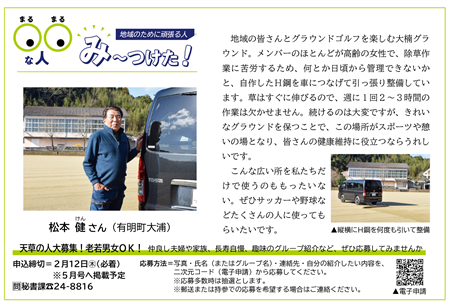 天草の人大募集!「市政だより天草」に応募しませんか【○○な人み~つけた!】 最終更新日:2026年1月27日 印刷 仲良し夫婦や家族、長寿自慢、趣味のグループ紹介など、ぜひ応募してみませんか。「市政だより天草」令和8年5月号でご紹介します。応募対象=天草市民申込締切=2月12日(木曜日)【必着】※応募多数時は抽選します。※6月号への申込締切は3月12日(木曜日)の予定です。応募方法 写真・氏名(またはグループ名)・連絡先・自分の紹介したい内容を、電子申請システムから応募してください。電子申請システム:https://apply.e-tumo.jp/city-amakusa-kumamoto-u/offer/offerList_detail?tempSeq=15829(外部リンク)※郵送または持参での応募を希望する場合はご連絡ください。